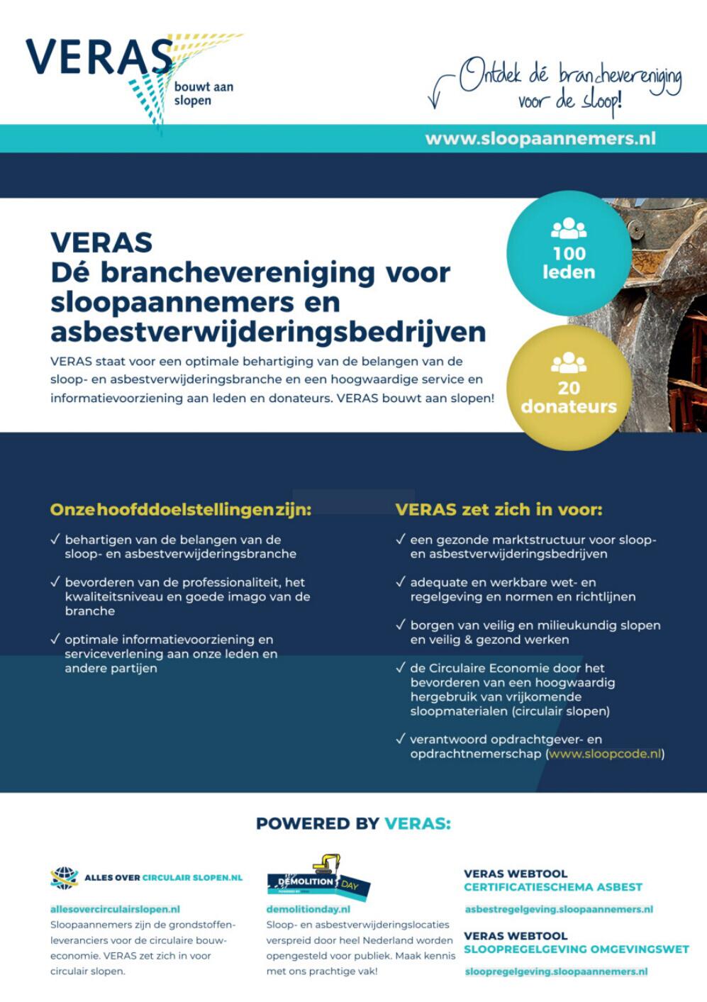 Sloop- en asbestverwijderingsbedrijven kunnen lid worden van VERAS. Als u lid wordt van VERAS draagt u bij aan de belangenbehartiging van de sloop- en asbestverwijderingsbranche en geniet u van de voordelen van het lidmaatschap.