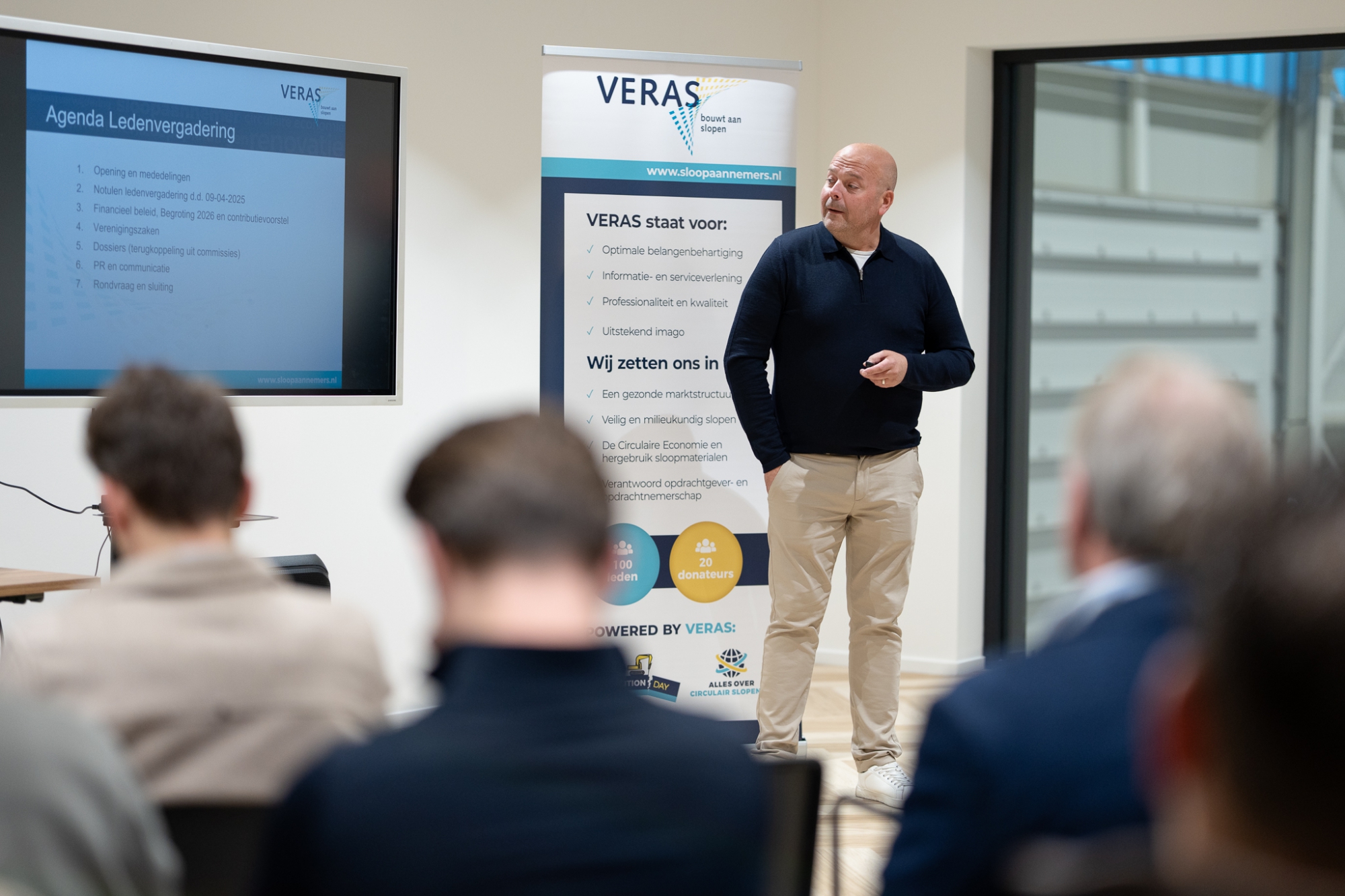 Na een hartelijke en gastvrije ontvangst startte voorzitter Kees de Groot de ledenvergadering. Aftredende bestuursleden Jan Bork en Dirk Lagemaat zijn door de ledenvergadering unaniem herkozen. VERAS is blij dat deze zeer gewaardeerde bestuursleden zich blijven inzetten voor onze vereniging. Verder zijn tijdens de ledenvergadering kort de actuele dossiers besproken waar VERAS zich mee bezighoudt. De heer Hol van het secretariaat heeft de stand van zaken rondom de implementatie van de Europese Asbestrichtlijn toegelicht en de leden opgeroepen om vooral ook de online informatiebijeenkomst over de asbestdossiers op 25 november bij te wonen. De voorzitter heeft namens de PR commissie aangekondigd dat op zaterdag 19 september 2026 de vijfde editie van Demolition Day plaatsvindt en dat hij hoopt dat veel lidbedrijven deel zullen nemen aan de lustrumeditie van deze belangrijke open dag voor onze branche. Tevens gaf de voorzitter een update over de ledenwervingsaanpak. Een eerste promofilmpje werd tijdens de vergadering getoond en VERAS werkt er hard aan om in 2026 veel nieuwe leden welkom te heten. Hoe meer leden, hoe groter onze stem en hoe meer we kunnen bereiken!
