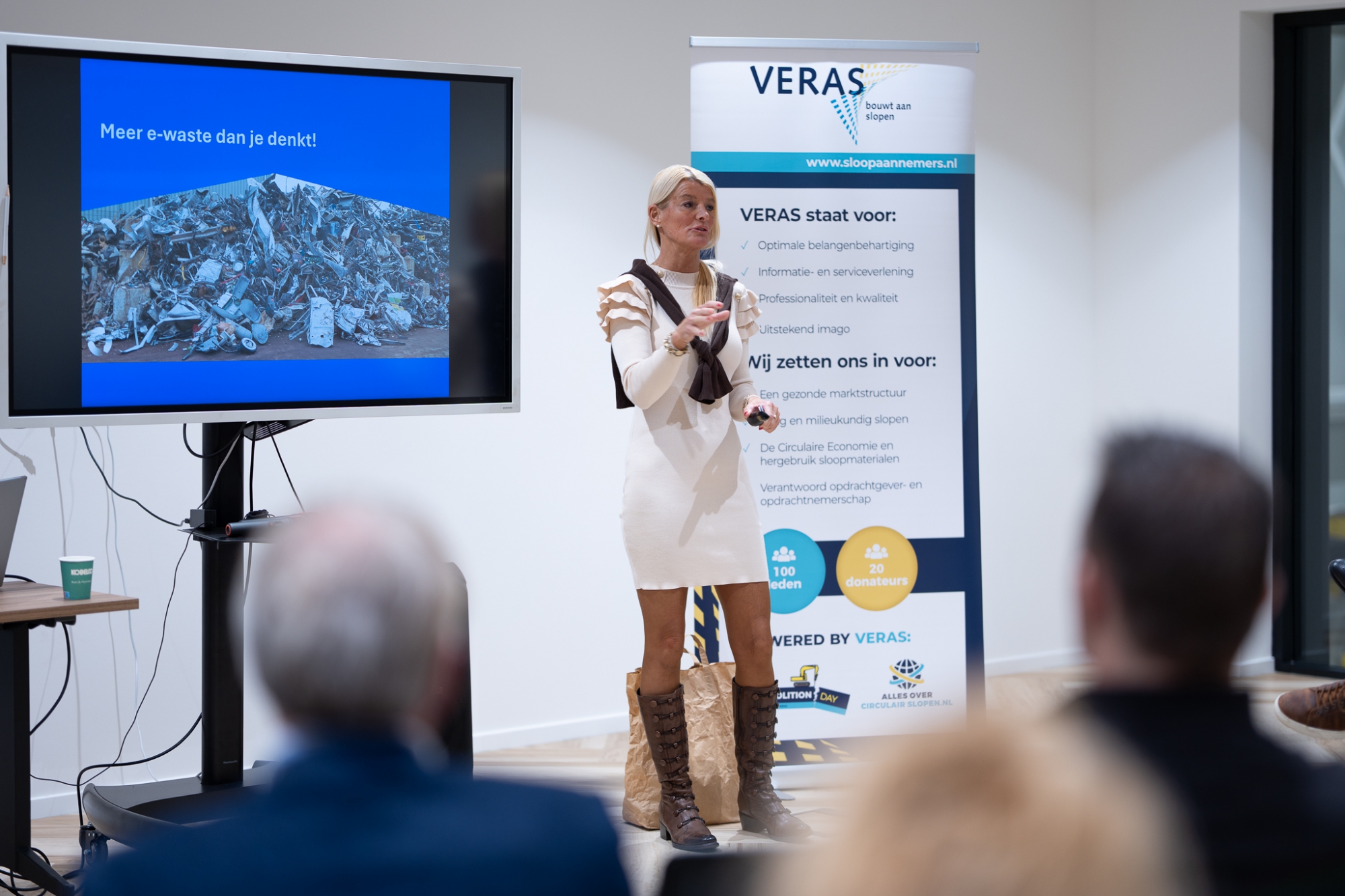 Daarna was het woord aan Esther Musch van Stichting OPEN. Zij informeerde de leden en donateurs over de afgifteplicht voor afgedankte elektrische en elektronische apparaten (AEEA), die niet per 1 januari 2026 maar naar verwachting medio 2026 ingaat. Ze wees de sloopaannemers op de Stimuleringsregeling e-waste, waar bij afgifte van AEEA een vergoeding wordt gegeven bovenop de materiaalwaarde. Ook kunnen sloopaannemers via Stichting OPEN kosteloos een batterijvat op hun werf krijgen.