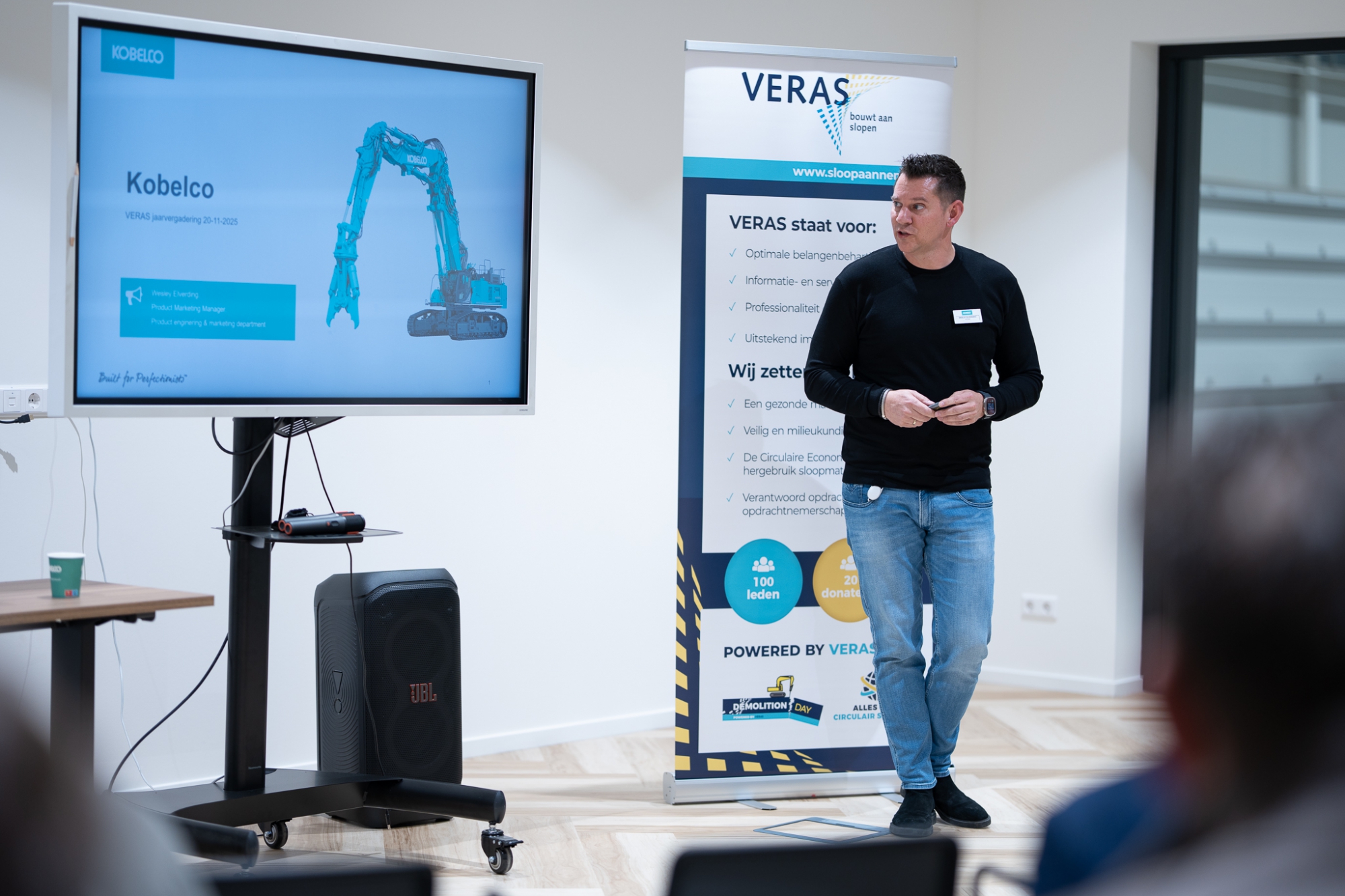 Na een korte pauze gaf Wesley Elverding, Product marketing manager van KOBELCO, een presentatie over het Japanse bedrijf KOBELCO, over de nieuwe vestiging in Lelystad van waaruit zij de Europese markt bedienen en over hun productlijnen, in het bijzonder de machines voor sloopwerkzaamheden. Tot slot gaf Marcel Vening van DEMAREC (ook donateur van VERAS) een presentatie over en zijn visie op de gereedschappen, zoals scharen, vergruizers en knippers die zij bieden voor de sloopbranche. Buiten stonden drie machines van KOBELCO met gereedschappen van DEMAREC opgesteld, die de leden en donateurs konden bekijken.